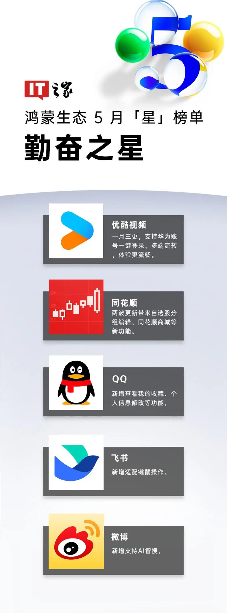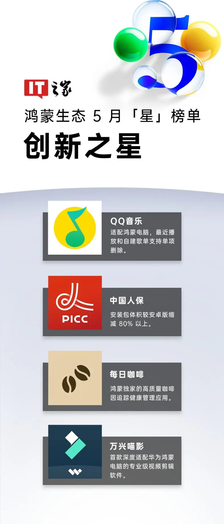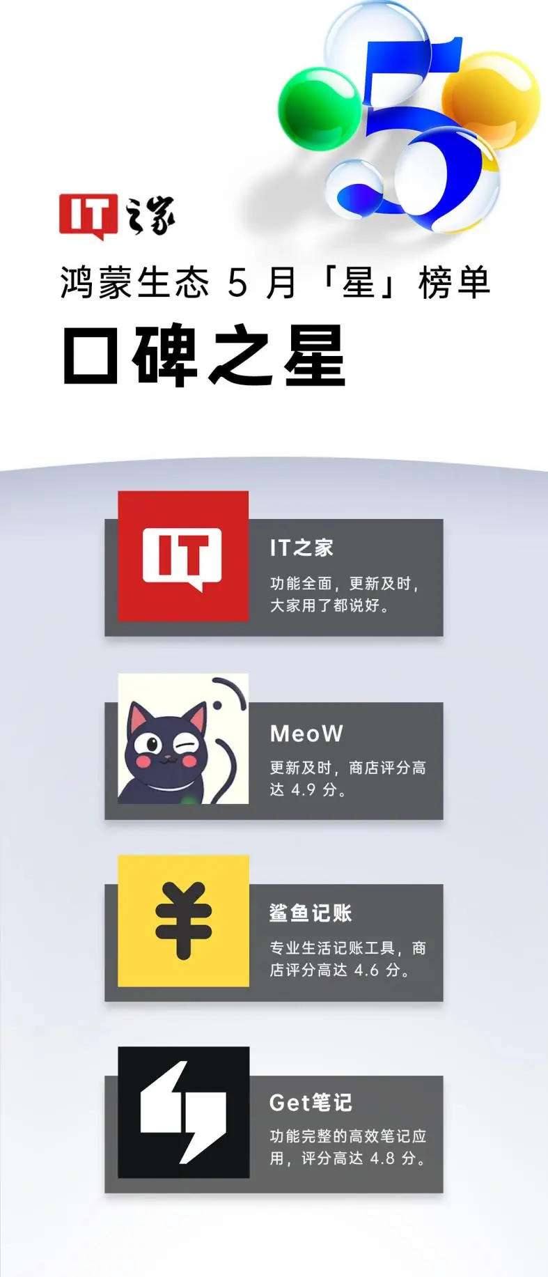 而今天,IT之家综合征集贴下小伙伴们分享的建议、鸿蒙应用市场上新情况以及应用市场评分等多维度信息,整理并发布《鸿蒙生态 5 月“星”榜单》。