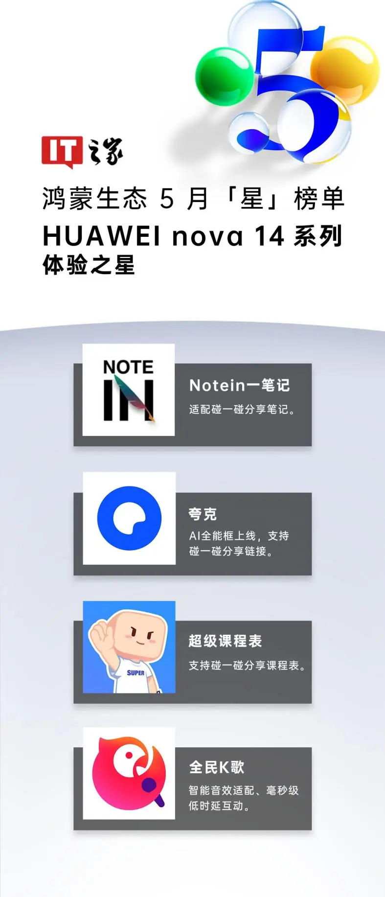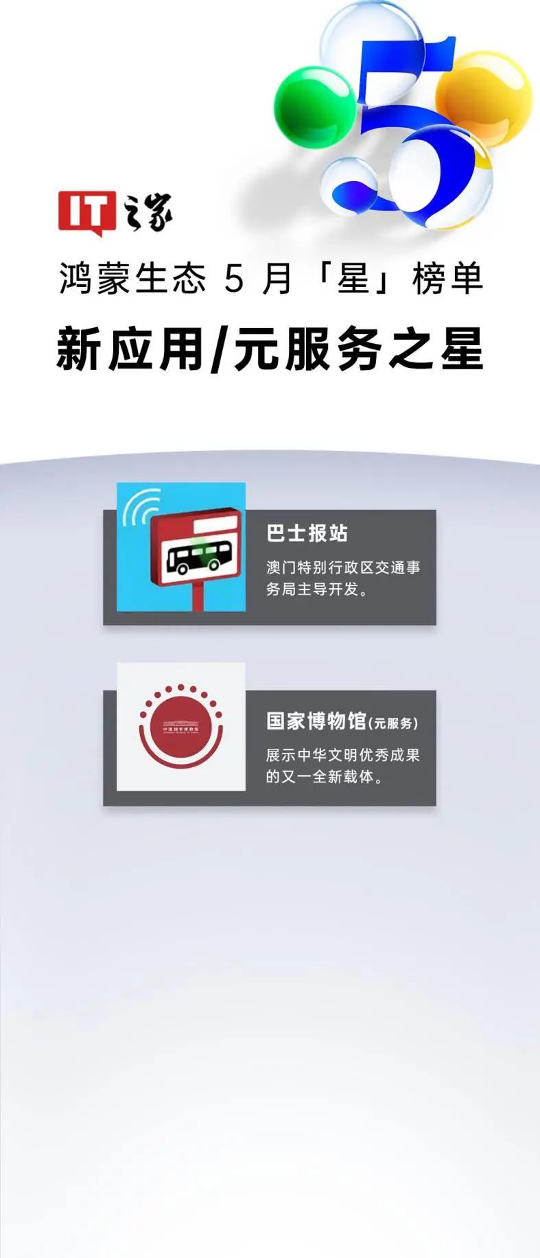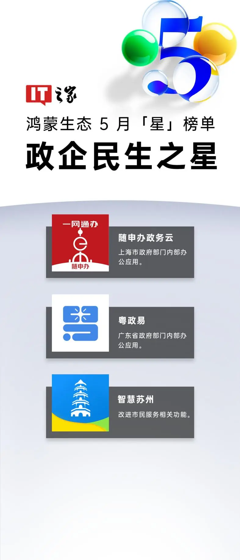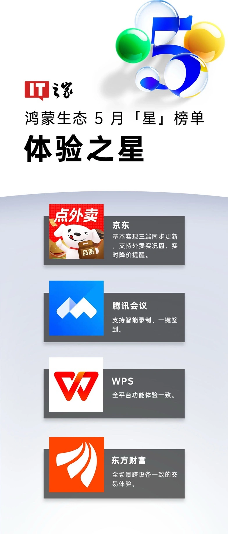 而今天,IT之家综合征集贴下小伙伴们分享的建议、鸿蒙应用市场上新情况以及应用市场评分等多维度信息,整理并发布《鸿蒙生态 5 月“星”榜单》。